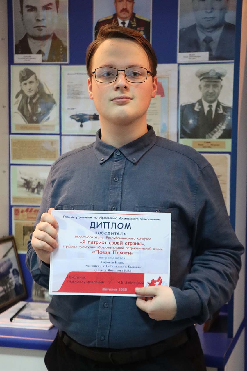 Иван Сафонов — будущий выпускник гимназии г. Быхова, активист, отличник, победитель олимпиад, экскурсовод школьного музея, председатель самоуправления «Факел», член ОО «БРСМ». Он организатор и ведущий школьных мероприятий, обладатель аттестата особого образца. В этом году Иван занял первое место в районной олимпиаде по английскому языку, второе — по информатике, а также стал призером республиканской олимпиады по английскому языку.