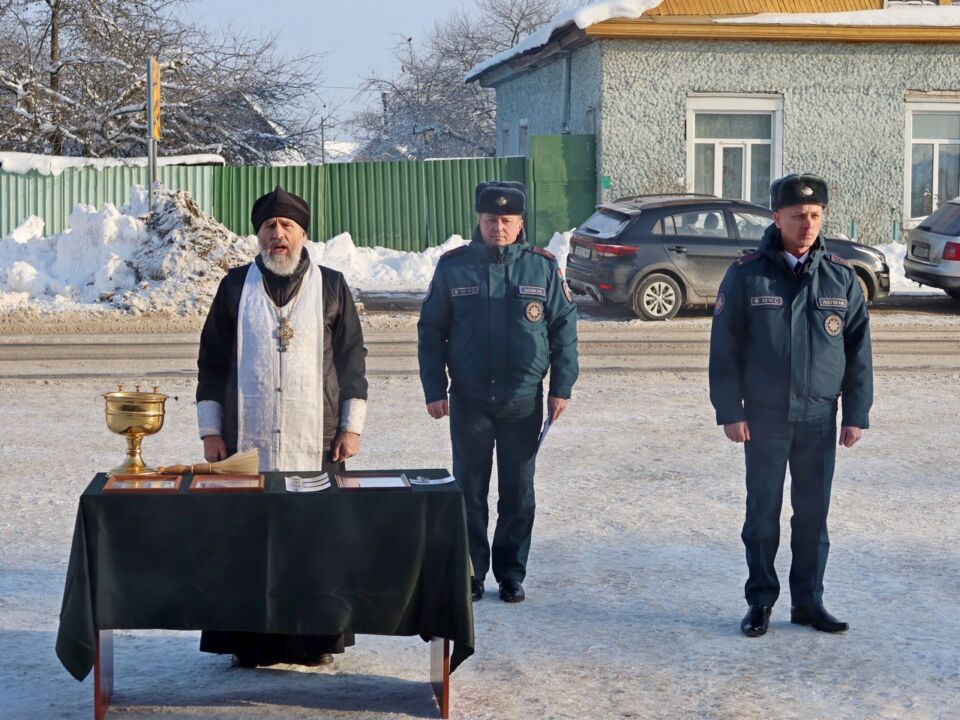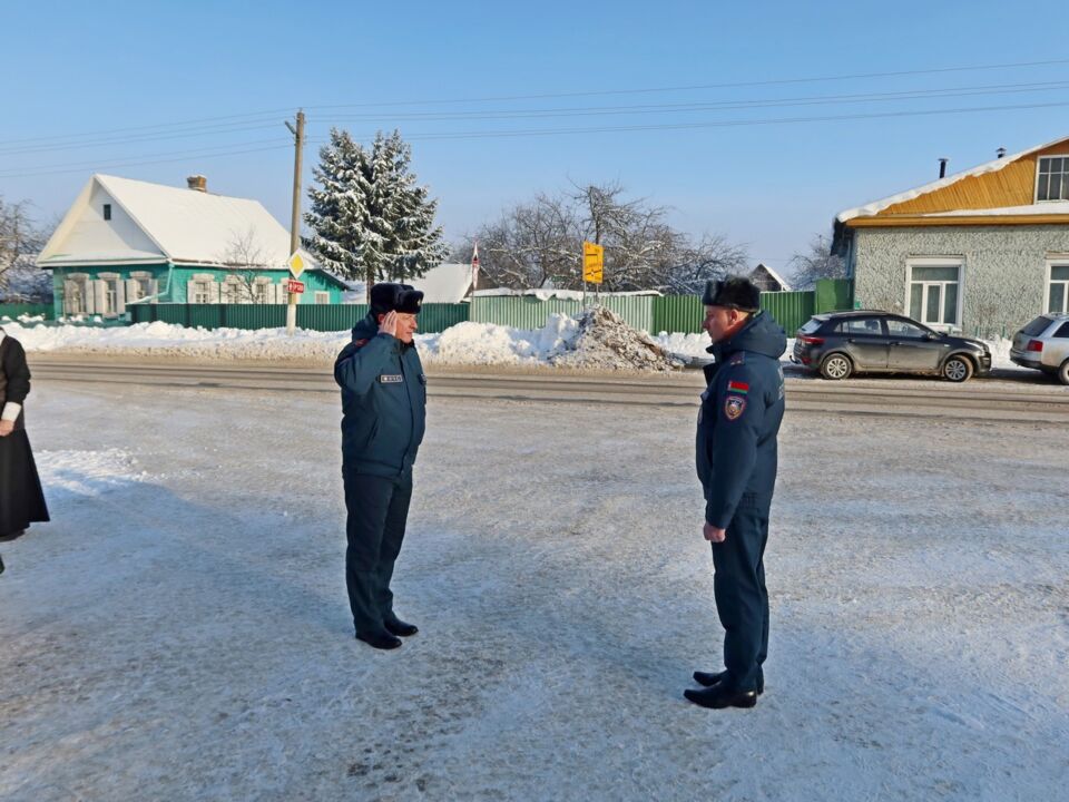 Про ответственность работников РОЧС за жизни людей говорил благочинный Быховского округа протоиерей Николай. Он пожелал спасателям и их семьям Божьего благословения, радости и счастья, отметив, что важно встречать жизнь с минимальным количеством чрезвычайных ситуаций. После этого он провел обряд освящения водой личного состава, техники и помещений.