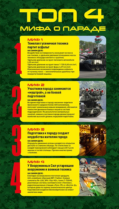 Тренировки и проведение парада являются составной частью боевой подготовки войск. Личный состав совершенствует навыки вождения и обслуживания закрепленной за ними техники, повышает профессиональное мастерство. Особое внимание при подготовке водительского состава уделяется отработке вопросов соблюдения дистанции, скорости движения и слаженности в составе колонн. Для отработки данных вопросов в течение 5 часов три раза в неделю водители преодолевают около 60 километров, а всего за время подготовки к параду около 300 километров.